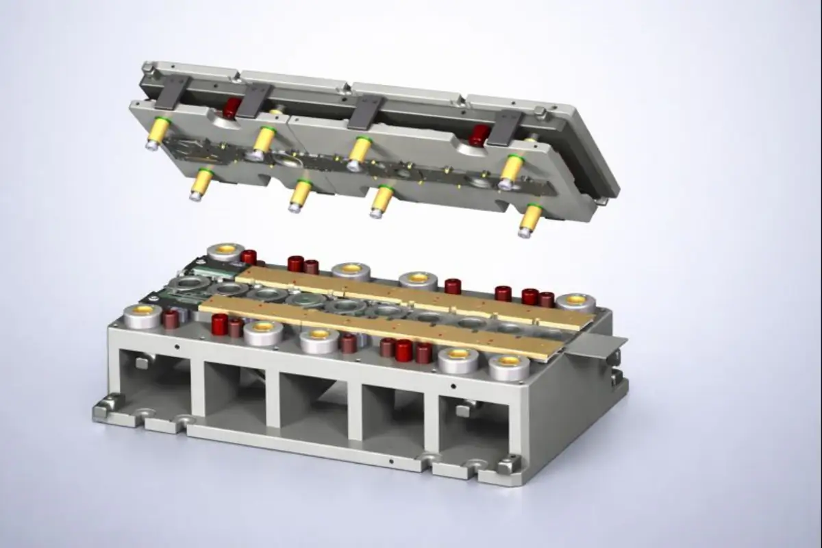 The tool base body consists of an upper and a lower structure that are guided in the press and aligned precisely to each other. Guide rails, guide posts, and bushings ensure that punch and die are correctly positioned relative to each other at every stroke position. Guidance determines not only dimensional accuracy but also the tool life of cutting edges and forming contours.